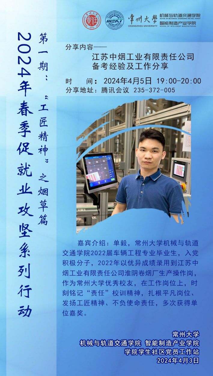 为深入学习贯彻党中央、国务院“稳就业”“保就业”决策部署,落实江苏省2024年春季促就业攻坚攻坚系列行动,4月5日,学院党员工作站邀请2022届车辆工程专业毕业生单毅,通过腾讯会议分享江苏中烟工业责任有限公司备考经验及工作分享。